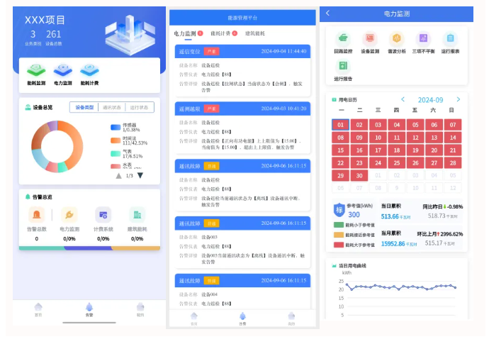 智慧能源管理移动端包括APP和小程序(公众号),项目管理人员可以通过手机APP查询各类能耗用量明细和能耗告警,实现设备监测、控制和运维等功能,终端用户可以通过小程序(公众号)实现余额充值、账户管理、用量查询、账单查询功能。